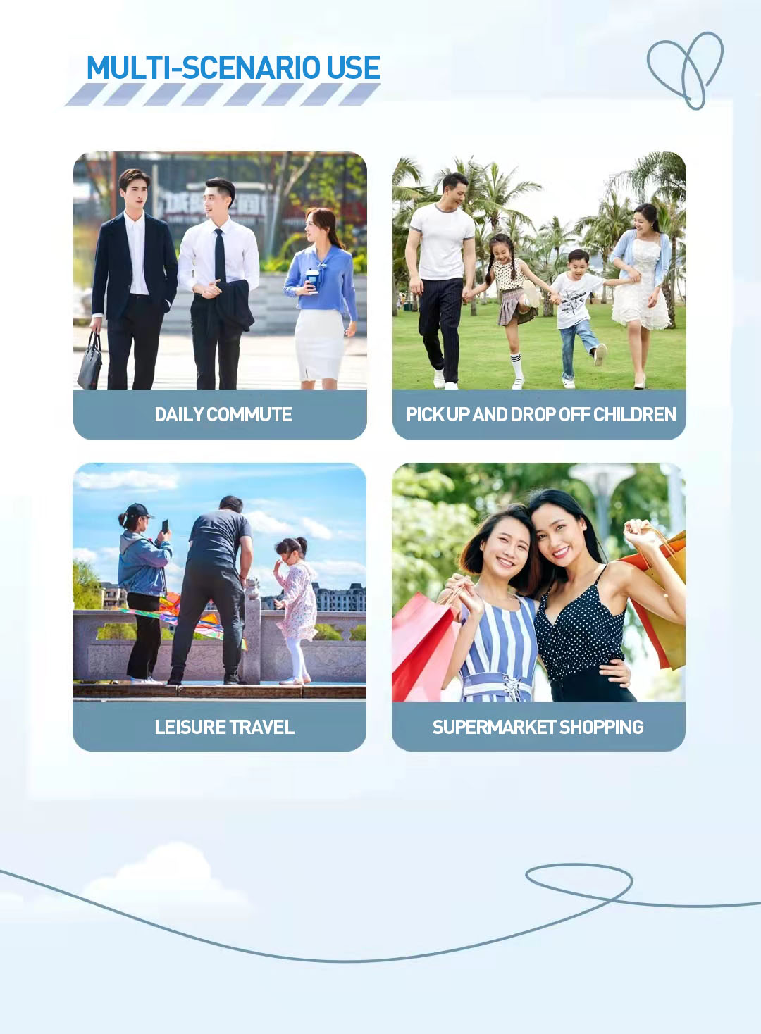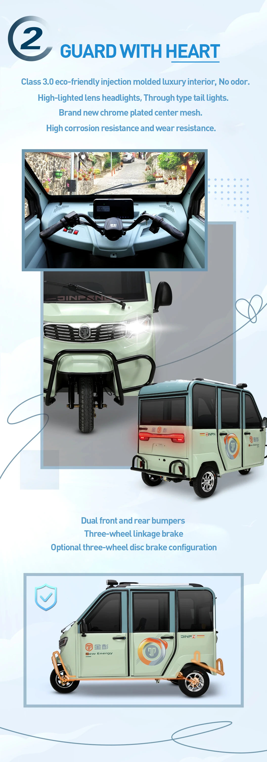 • Safety design: double bumpers are set at the front and rear. The front of the car is equipped with highly translucent headlights and the rear is equipped with through-type taillights. Three-wheel linkage braking. short braking distance. safe and guaranteed