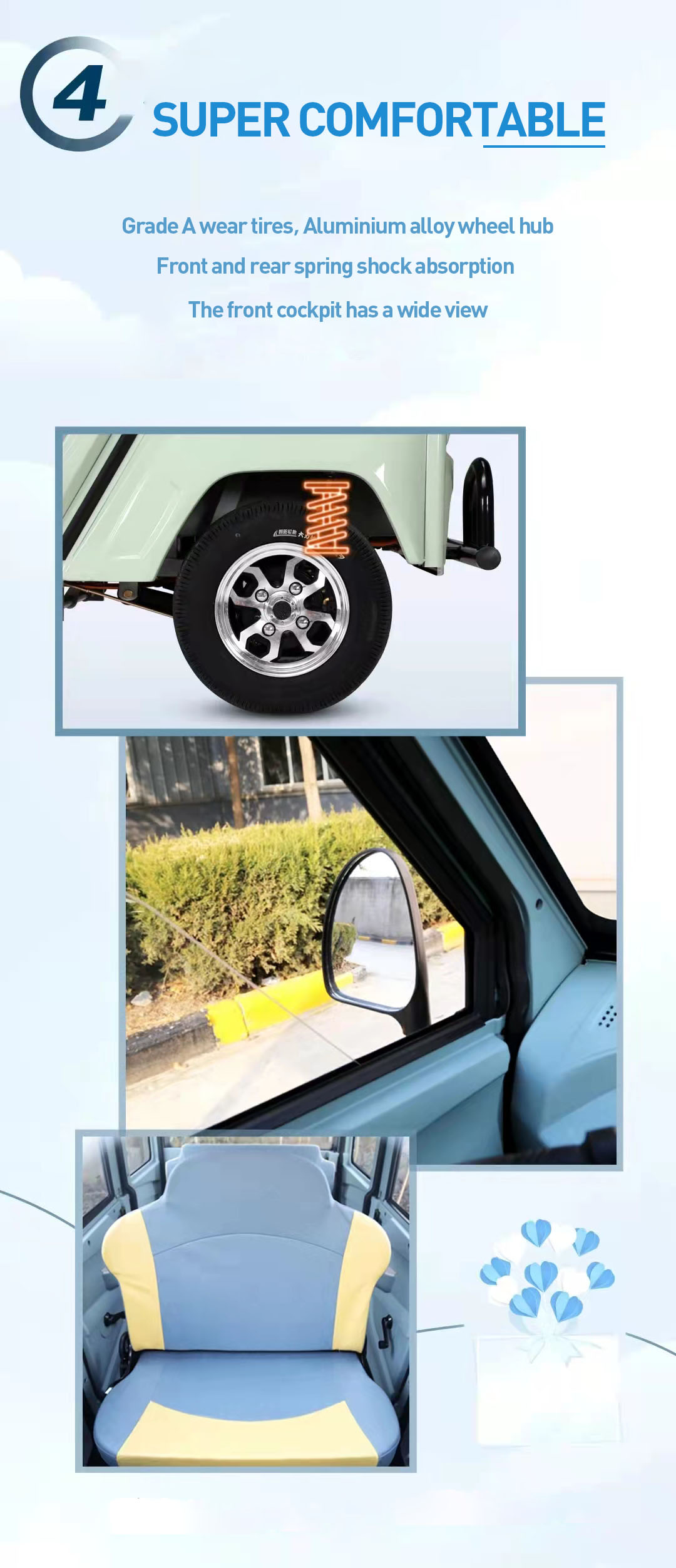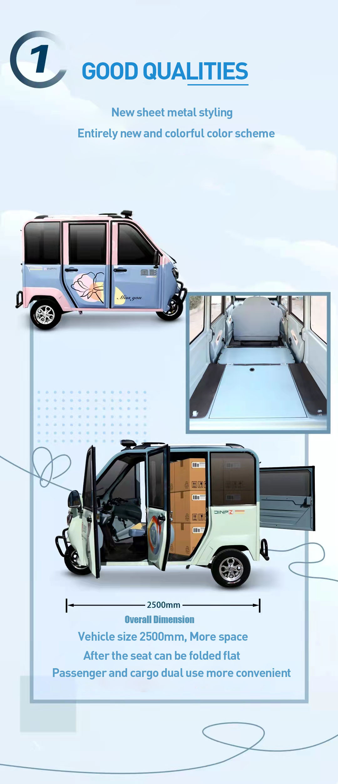 • Large space: The entire vehicle size is 2500*1195*1670mm and the vehicle length is 2.5 meters. which makes the vehicle feel larger. The rear seats can be folded to increase cargo space.
