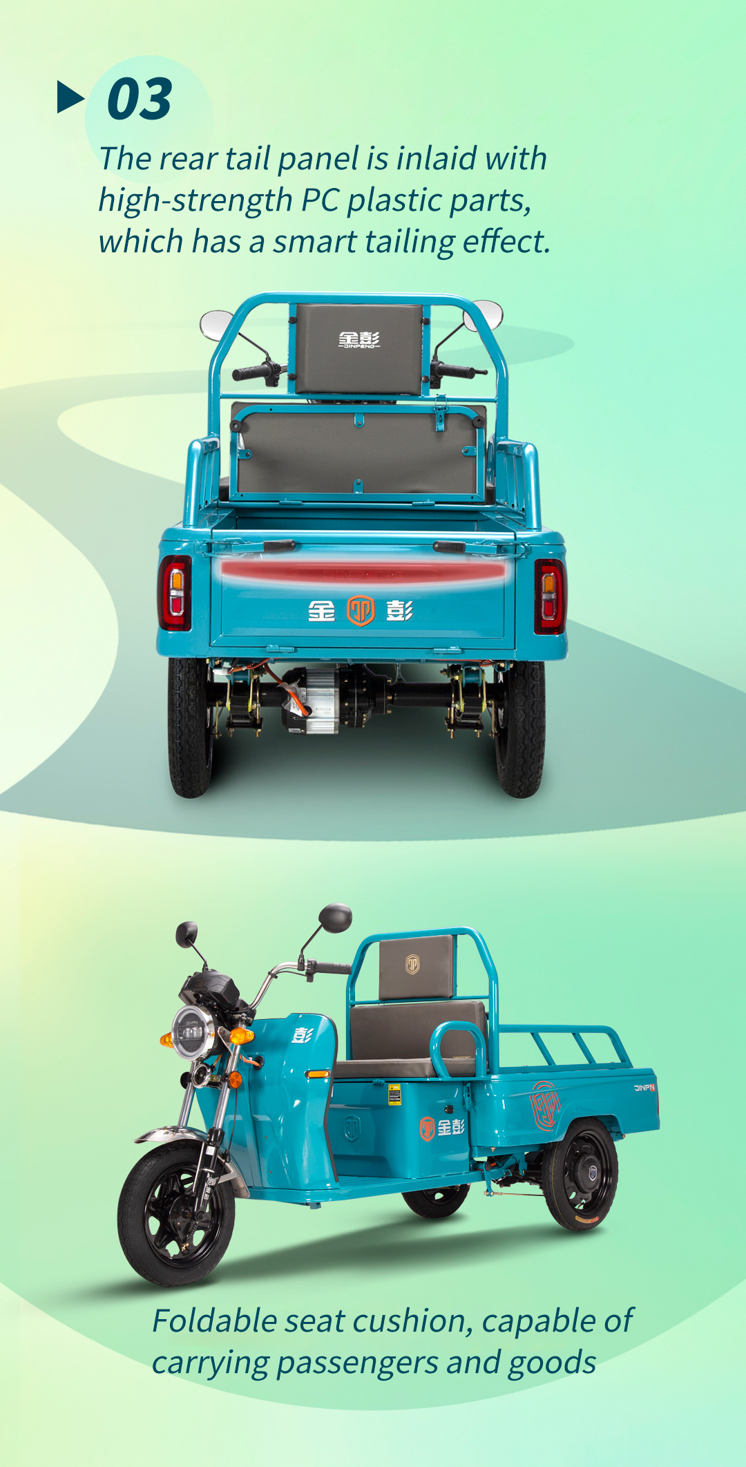 Folding Seat Cushion: The flexible design features a foldable seat cushion that can be lowered to accommodate two passengers. achieving dual functionality for both passenger and cargo transport.