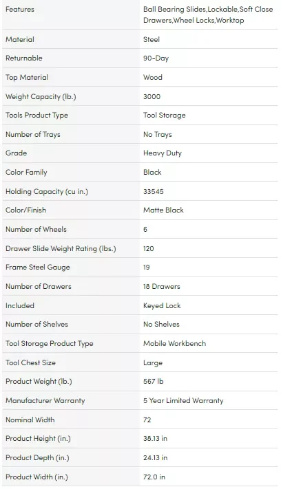 Home / Tool Box / HEAVY-DUTY 72 IN. W 18-DRAWER, DEEP TOOL CHEST MOBILE WORKBENCH IN MATTE BLACK WITH ADJUSTABLE-HEIGHT HARDWOOD TOP